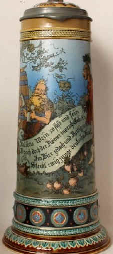 This large, etched stein was designed by Heinrich Schlitt and marked with the Mettlach logo,