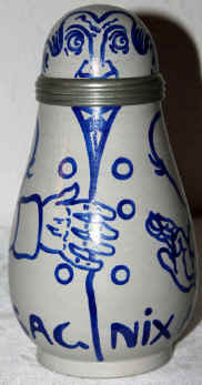This pot-bellied gentleman seems to be saying and motioning with his left hand that he doesn't want anymore or that he's not going to say anymore. Every word in this sentence is a cognate (a word that looks and sounds almost the same in both German and English). The pottery figural stein is marked with the J. Reinemann Munich logo and "45" and possibly designed by Franz Ringer, ca. early 1900's. | |