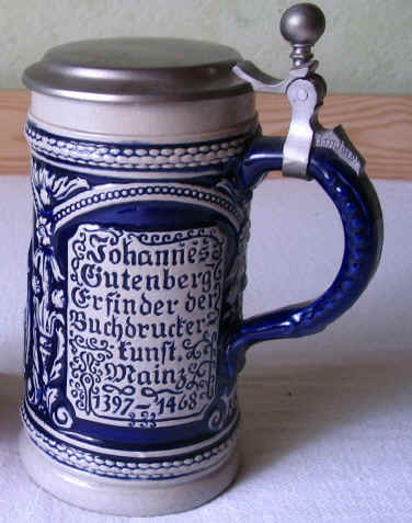 | This ca. post WWII, light-relief stein appears to be a tribute to the famous Johannes Gutenberg (1397 - 1468) born in Mainz, Germany. His illustrious career included the invention of movable type printing (1440) in Strasbourg (now in France) and the printing of the famous Gutenberg Bible in 1455 and much more. | |