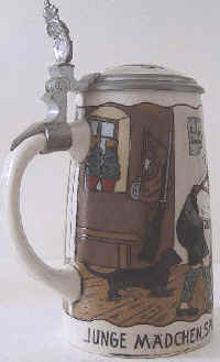The two young maidens are drinking beer and attentively watching the young men at Fingerhakeln (finger wrestling). The etched, Jugendstil (youth style = modern art) stein is marked with the Mettlach logo, form number 3350 and date 1911. | |