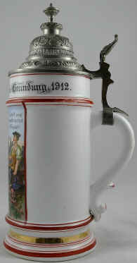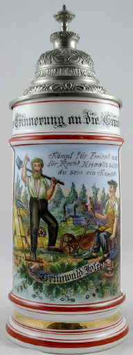 | This porcelain stein with a lithophane base (scene in base viewable when held up to the light) was owned by Joseph Grünwald who was apparently a member of a socialist/communist society founded in 1897. The legend at the top, "1897 Zur Errinerung an die Gründug 1912", indicates that this was the 15-year jubilee from the founding of the society, and he purchased the stein in 1912. It might have sounded like a good idea, but I suspect that Joseph never made it past being a farmhand. | |