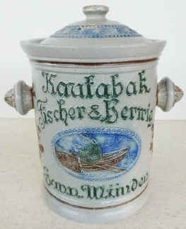 This salt-glazed, stoneware chewing tobacco jar with lid is marked with the logo of Eckhardt & Engler, ca. early 1900's. Chewing tobacco was a favorite thing to do at the turn of the last century and might gain prominence again with tobacco smoking gradually phasing out. | |