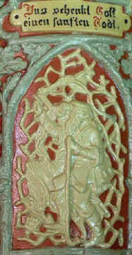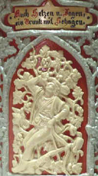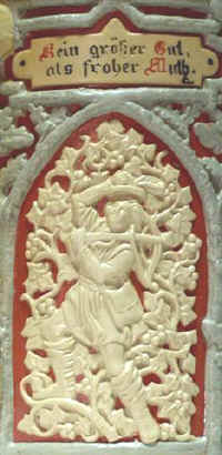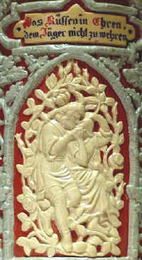 Kein größer Gut als foher Muth. Das Küßen in Ehren, dem Jäger nicht zu wehren. Nach Hetzen und Jagen, ein Trunk mit behagen. Uns schenkt Gott ein sanfter Todt. |
