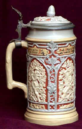 This is a 1/2 L. applied relief Mettlach stein #24 designed by Ludwig Foltz II in the 1850's. It is an 1893 version listed in the original Mettlach catalog as "Jagd" (hunt) and describes events in the life of a hunter. | |