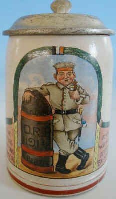 | The Germans thought they could overcome any obstacle in WWI with "Dicke Berta" (Big Bertha), a howitzer (artillery cannon) mounted on a railroad car that could shoot a bullet almost half as big as the soldier on this stein over 30 miles, but it didn't turn out that way. The stein is of the period ca. 1914. | |