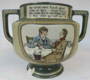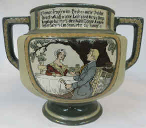 The verse is the first part of a student drinking song "der Lindenwirt" (Keeper of the Lime Tree Inn) by R. Baumbach 1876 on a 6.75 L. etched Mettlach punch bowl mold number 3334 designed by Fritz Quidenus and advertised in the 1911 Mettlach price list for 18.00 Deutschmark without the lid. | |