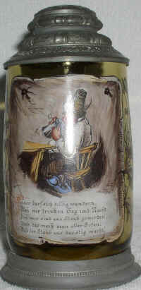 | Those wily German drinkers think of every excuse to further their cause. This nice transfer and hand painted, glass stein is, ca. late 1800s. | |