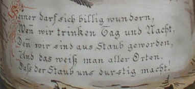 Keinen darf sich billig wundern, wenn wir trinken Tag und Nacht, denn wir sind aus Staub geworden und das weiß man aller Orten, daß der Staub uns durstig macht! |