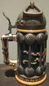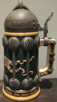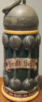 This is a character stein with a barbell body and a lifting weight lid designed specifically for the weight lifting segment of the Turnverein (gymnast's association). On the lid is also the often misinterpreted motto: Kühn, Kernig, Kraftvoll, Kunstvoll (Daring, Robust, Powerful, Skillful). The word Kernig sounds the same as König (king), but means pithy as in full of substance. The weight lifter's four -"K" motto was probably a spin-off of the Turnverein's four-"F" motto. (see translation: "Gut Heil"). The stein is marked "Germany, 1227 and 5", ca. 1900. | |