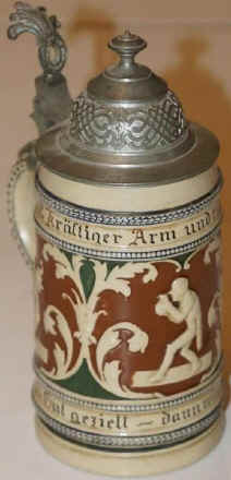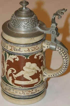 These are the things one must keep in mind when bowling and a few other things on this relief stein with a bowling theme marked with the Reinhold Merkelbach logo and "795", ca. 1900. | |