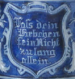 It's not clear if the loved one is a person or a beer stein, but either way the message should be obeyed. This is a blue/gray, salt-glazed, stoneware stein marked with the logo of Merkelbach & Wick, ca. late 1800's. | |