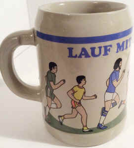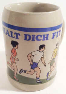 This stein without lid is saying "keep fit by running, but also with a good beer afterward". It's interesting to note how some English words like "fit" have crept into the German language especially after WWII when this stein without lid was made. It's marked "W. Germany". | |