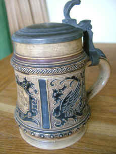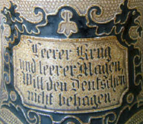 Here's a salt glazed stoneware stein from Regensburg ca. 1880's. It has short rhyme. | |