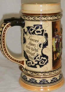 The verse sounds sad, but it looks like the crowd on the front is making up for it on this relief stein without lid marked "GT" for designer Gustav Thinwiebel probably made by Marzi & Remy, ca. 1900. | |