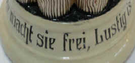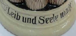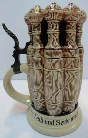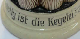 This pottery character stein marked "1139 Germany" represents the game of Skittles or Nine-Pins, the forerunner of bowling (with ten pins) as we know it ca. 1900. See also the translation of "Alle Neun". | |