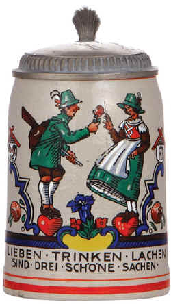 I couldn't agree more with the sentiment presented on this salt-glazed, stoneware, Jugendstil (youth style = modern art) stein designed by Paul Neu, ca. early 1900's. | |