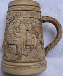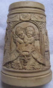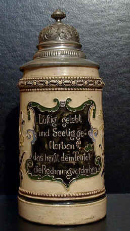 This verse can also be seen on the earthenware stein without lid marked with the logo of John Maresch and number 9736, ca. 1900, shown below. | ||