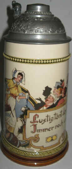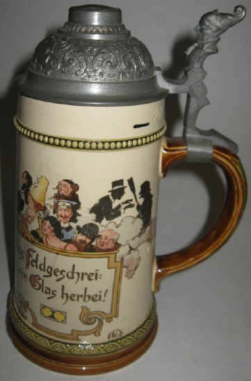 Some good cognates on this scene of a lusty, party crowd shrieking always for another glass of beer or whatever. This is a PUG (printed under glaze) Mettlach (often seen without the Mettlach logo) stein marked with mold number 2271, decor number 1020 and date 1899. | |