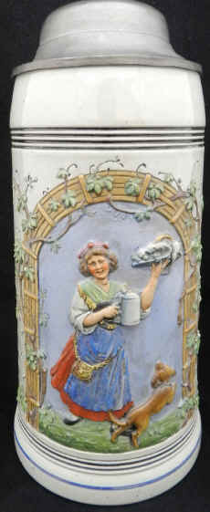 In the German beer culture, the Kater (tom-cat) is the symbol of a hangover and the Herring (herring) is a cure. So the verse here is a play on words meaning that they didn't teach in zoology class that eating herring would cure a hangover. The stein is marked with the logo of Eckhart & Engler of Hohr and mold number 1291, ca. early 1900's. See: Chris Wheeler's "Stein Marks" for more info on this company. | |