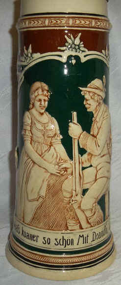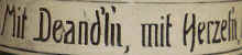 This verse is in Bayerisch (Bavarian dialect) on a relief stein by artist "GK" ca. 1900. Note that the word "Rüchserl'n" on the stein should read "Büchserl'n". | |