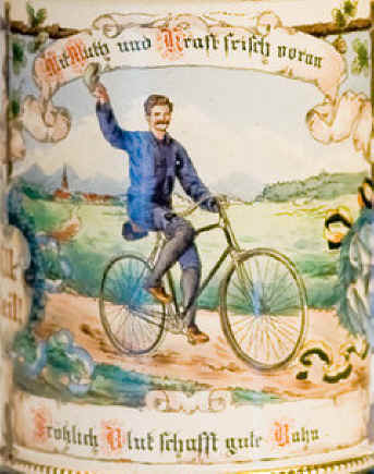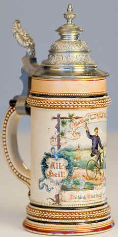 This stein is designed for a Radler (cyclist) with the motto All Heil! that cyclists would greet each other with on the road. The stein was probably made by Marzi & Remy ca. 1900. | |