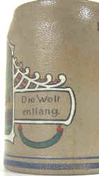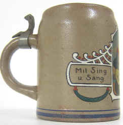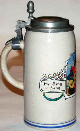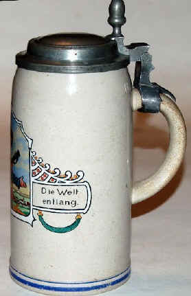 | Here is a very optimistic and carefree view of life and the world on this Jugendstil (youth style = modern art) stein. The stein was made by Marzi & Remy, mold #1410, ca. early 1900's. Two versions of the stein are shown below. | |