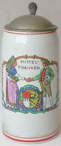 | This is a Jugendstil (youth style = modern art) stein with the Wappen (arms) of Middle Franconia which is a district in Bavaria that has Ansbach as its capitol city and Nuremberg as its most populous city, ca. early 1900's. | |