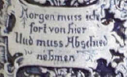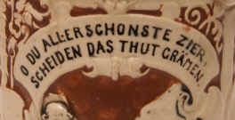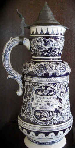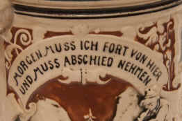 Some of this translation is not literal, but the meaning is correct. This is a reproduction stein made after WWII by Thewalt and marked with the Thewalt logo of the period and "Original Mold Year 1894 - 2 L. - Western Germany - 6". | |