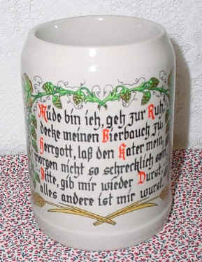 Müde bin ich, geh zur Ruh, decke meine Bierbach zu, Herrgott laß denn Kater mein, Morgen nicht so schrecklich sein; Bitte gibt mir wieder Durst, alles andere ist mir wurst. |