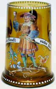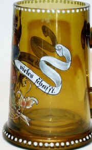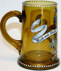 Many things like beer and wine we're told produce courage and strength on this enameled, amber-glass stein without lid, ca. late 1800's. | |