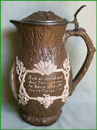 | This 4 L. relief Mettlach master stein #1028 is in the form of a tree trunk with various grotesque faces embedded in the design, marked with the Mercury Mark dated 1884 and Roman "I" indicating the largest size. The verse is whimsical with the stein talking and the punch line is under the handle. | |