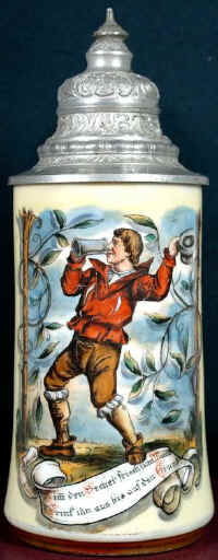 Party animals take a stein with fresh beer and chug-a-lug it down before it gets stale. This is a porcelain stein with lithophane base (scene in base viewable when held up to the light), ca. 1900. | |