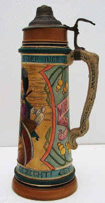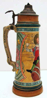 Sounds like an oxymoron verse on this tall etched probable JWR master stein ca. 1900. The salutation on the barrel is part Latin, but used frequently in German student songs. | |