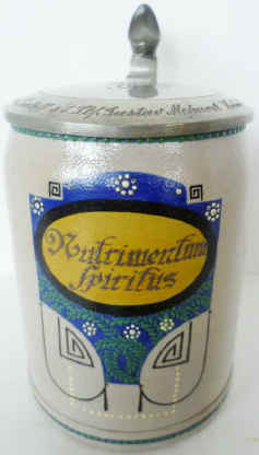 | This verse is in Latin. Its meaning is generally translated as "food for the soul" which is what beer is besides its usual use as "food for the body". The Latin translates to "geistige Nahrung" in German. The Jugendstil (youth style = modern art) stein is ca. early 1900's. | |