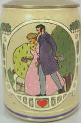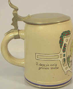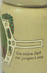 | The verse on this Jugendstil (youth style = modern art) stein (ca. early 1900's) is translated literally so the reader can see the cognates and rhyming, German construction. Les Hopper's compilation has a more poetic version: "May the beautiful time of the first young love last forever." | |