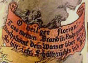 O Holy Florian! Let my fire burn in peace. Stream your water over me! but I beg don't let it pour into my beer! Fire is a great disaster, often also great in the glass: the former colors the heaven red, and the other the nose! |