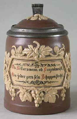 Self explanatory verse. Relief stein by Villeroy & Boch Mettlach, mold number 1180, dated 1889. | |