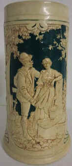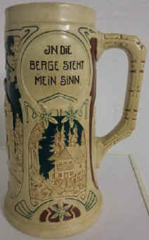 | Here's a sentimental verse with two lovers in the Alpine pasture on this relief stein without lid, ca. 1900. | |