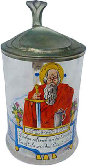 The second line of the verse is an idiomatic expression that St. Paul apparently observed about the Corinthians, but with his hand on the beer stein doesn't mean he disapproved. Ancient Corinth is said to have been a "sin city" where everything goes. The glass stein has elements of Jugendstil (youth style = modern art), ca. early 1900's. | |