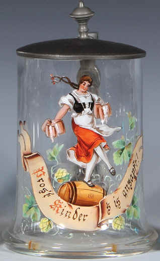 It looks like the patrons may have become a little restless and not acting their age while waiting for a new barrel of beer to be tapped. Hence the scolding remark by the barmaid. Pros't = Prosit and is Latin for "Pro sit" meaning "for your health". The transfer and hand painted glass stein is ca. 1900. | |