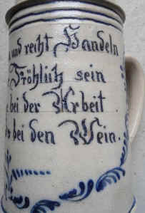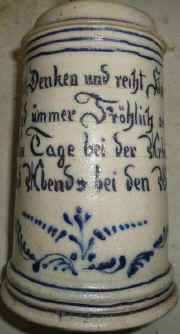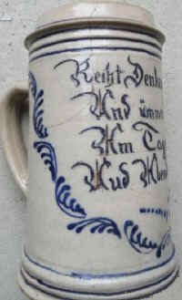 | This is a self explanatory verse on a blue/gray, salt-glazed, stoneware stein without lid, ca. mid-1800's. | |