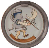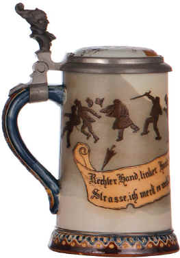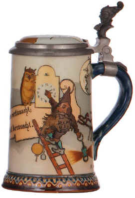 The verse is from an old German folk song which describes a Zecher (drinker) coming out of the local Kneip (tavern) in the middle of the night and finding himself totally confused about how to get home. See the verse starting with: Grad aus dem Wirthshaus komm ich heraus. for the beginning of the story. This etched stein is marked with the Mettlach logo and mold number 2092 designed by Heinrich Schlitt, ca. 1900. | |