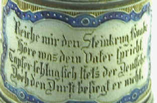 German patriotic drinking verse on a salt-glazed stoneware stein probably by Simon Peter Gerz marked "331" ca. late 1800's. | |