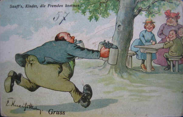 | You better drink up before the others get here, whoever they might be, seems to be the theme on this Ansichtskarte (picture post card), ca. 1900. | |