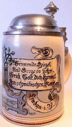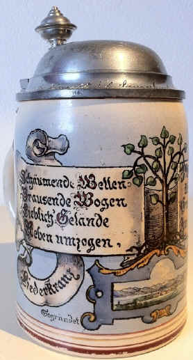 This verse is a tribute in song to the city of Lindau an island on Lake Constance (the Bodensee) in southern Germany by a singing group founded there in 1833. The stein is either transfer-printed or hand painted ca. late 1800's. | |