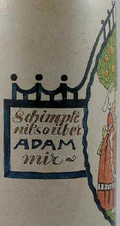 The precise meaning of this verse escapes me, but appears to have something to do with Adam and Eve and some kind of sinning under the apple tree. Perhaps the intent of the stein is to show that men have always fallen to the temptations of women. The Jugendstil (youth style = modern art) stein is similar to Franz Ringer designs and is marked with the logo of Merkelbach & Wick and retailer Gebrüder Thannhäuser of Munich, ca. early 1900's. | |