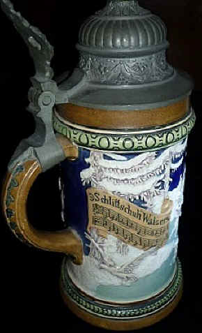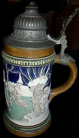 The "Skater's Waltz" is almost always played when one goes ice skating on a rink. The music was composed by Emil Waldteufel in 1882. The stein is marked with the logo of Hauber & Reuther and mold number "460", ca. 1900. | |