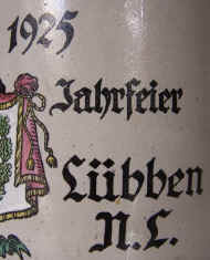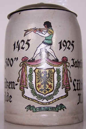This is a nice memento of the 500 year anniversary fair of the Shooting Guild in Lübben, Germany July 5-12, 1925. Nieder Lausitz is the name for the local area, just south of Berlin where the town of Lübben is located. The stein was decorated by "W. Haupt - Lübben" ca. 1925. | |