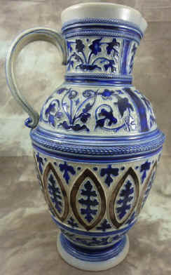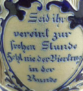If you're going to have a happy hour, you'd better have something to drink out of and it might as well be a beer stein. This is a light relief blue/gray, salt-glazed pouring stein marked with the Gerz logo and "612 A" ca. 1900. | |