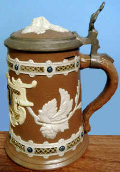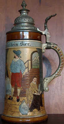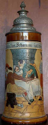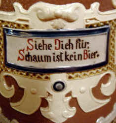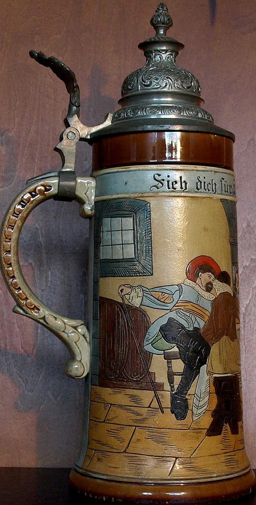 This verse is also found on the stein below, marked with the Mettlach logo, form number 1745, size number "V" ( Roman number 5) and dated 1901. The size number "V" means it is the fifth size down from 1 liter and in this case 1/4 liter which is also marked near the upper handle attachment. | ||